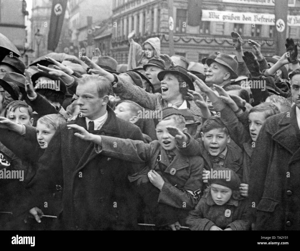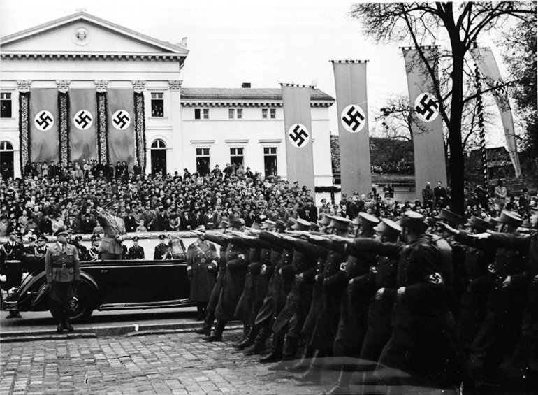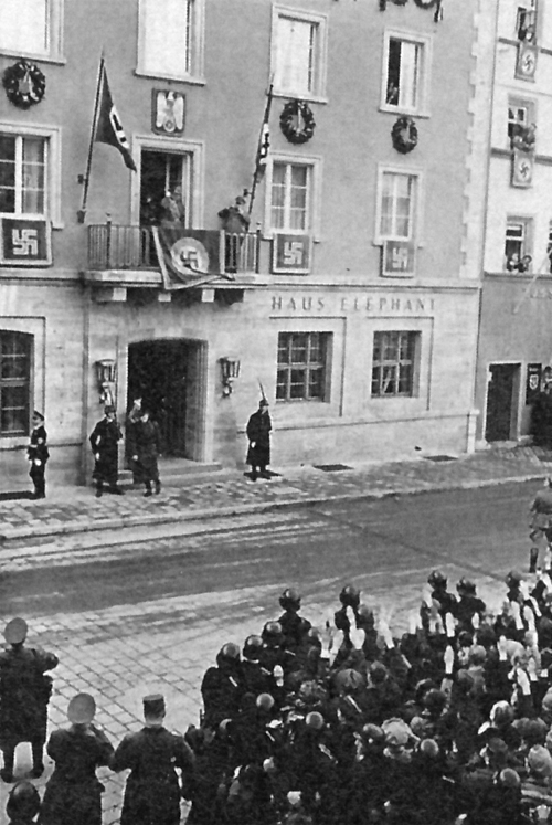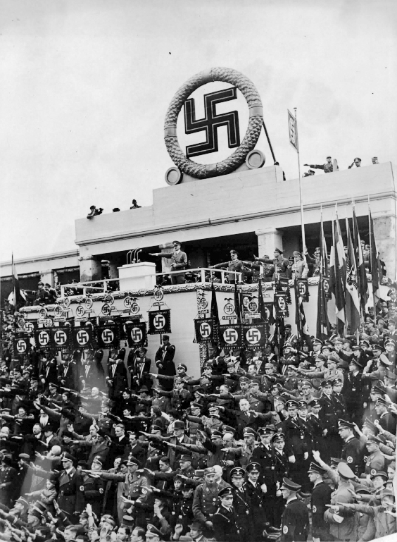 Photograph: Adolf Hitler makes a speech in front of 100,000 persons at the Gauparteitag in Weimar, Germany, 6 November 1938.