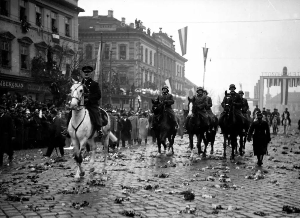 Hungary’s regent, Admiral Nicholas Horthy, today formally took possession of Hungary’s share of dismembered Czechoslovakia. Riding a white horse through a cold drizzle, he crossed the Danube by bridge into Komarom at the head of infantry, artillery, and cavalry regiments and tank units. Today was the second day in the progressive occupation of 4,875 square miles of former Hungarian territory which went to Czechoslovakia at the end of the world war and now goes back to Hungary by a decision of German and Italian arbitrators. Occupation of the zone, which amounts to one-fifth of the land Czechoslovakia acquired from Hungary twenty years ago, is to be completed by Thursday.