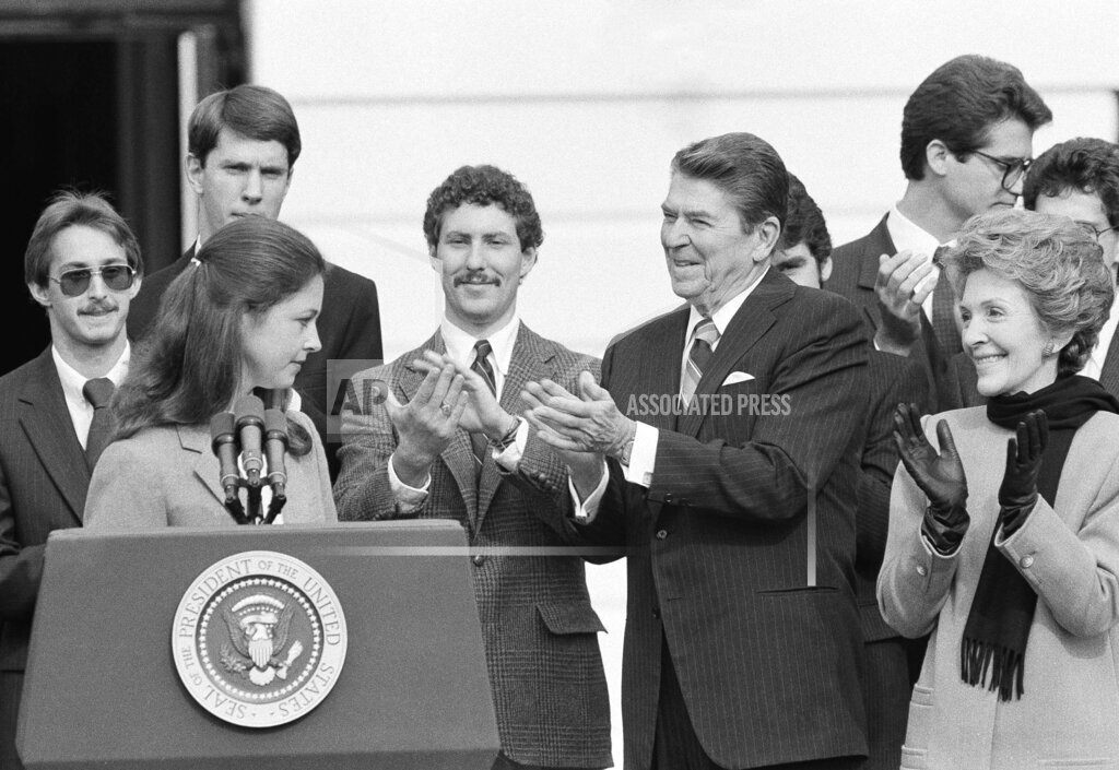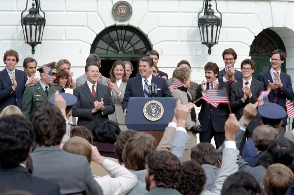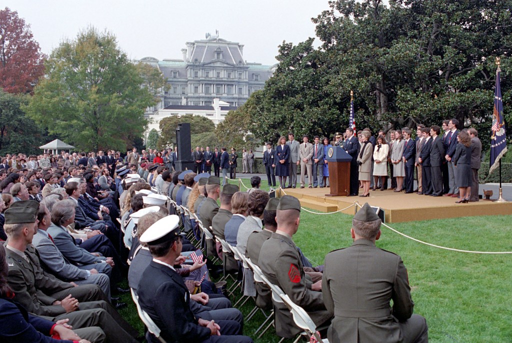 Photograph: The White House, 7 November 1983. President Ronald Reagan addresses the crowd with Nancy Reagan, Caspar Weinberger and John Vessey applauding on the South Lawn during the ceremony for the medical students from St George’s School of Medicine in Grenada.