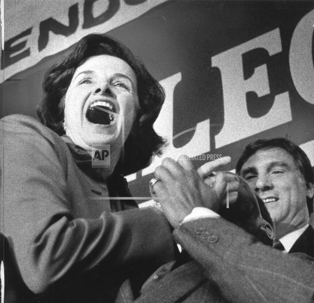 Photograph: Dianne Feinstein jokingly battles for the mike with Willie Brown at the podium as she is re-elected mayor of San Francisco, November 8, 1983.