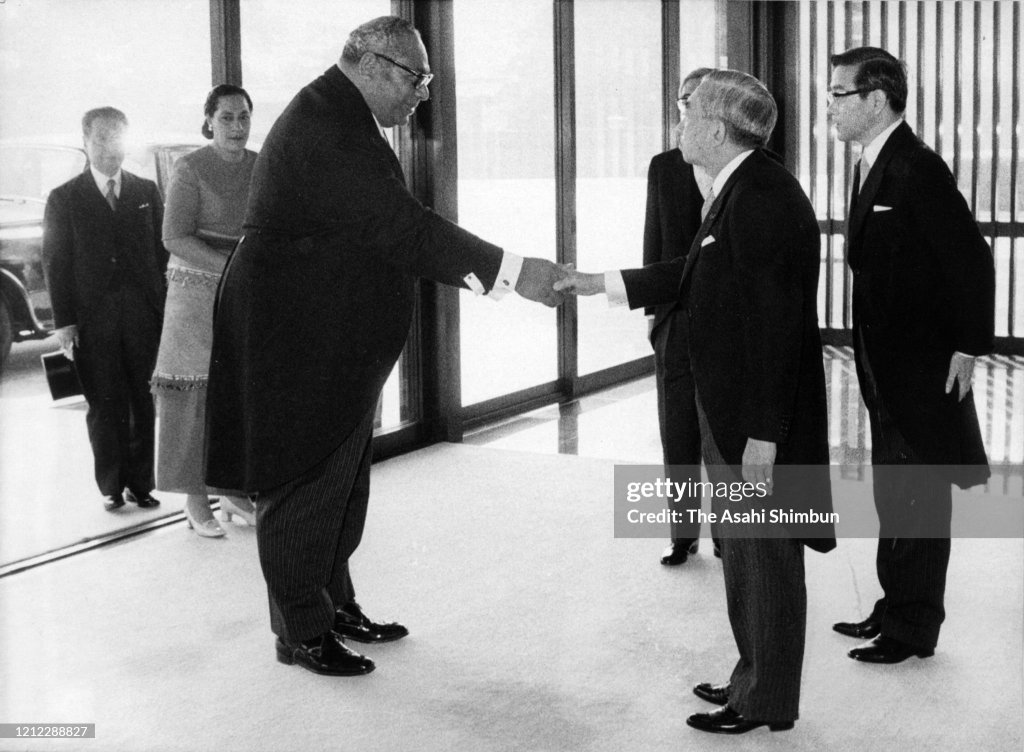 Photograph: King Taufa’ahau Tupou IV of Tonga shakes hands with Emperor Hirohito prior to their meeting at the Imperial Palace on November 9, 1973 in Tokyo, Japan.
