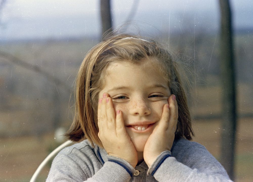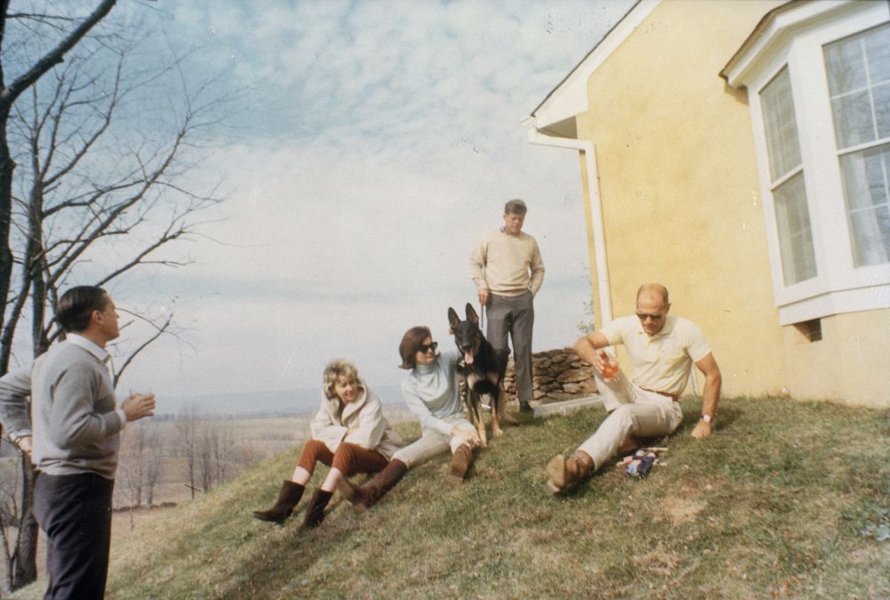 Photograph: November 10, 1963. President John F. Kennedy and First Lady Jacqueline Kennedy visit with family friends, Benjamin C. Bradlee (far left), Antoinette Bradlee (second from left), and Paul Fout (far right), at the Kennedy family residence, Wexford, in Atoka, Virginia. Kennedy family dog, Clipper, sits in center.
