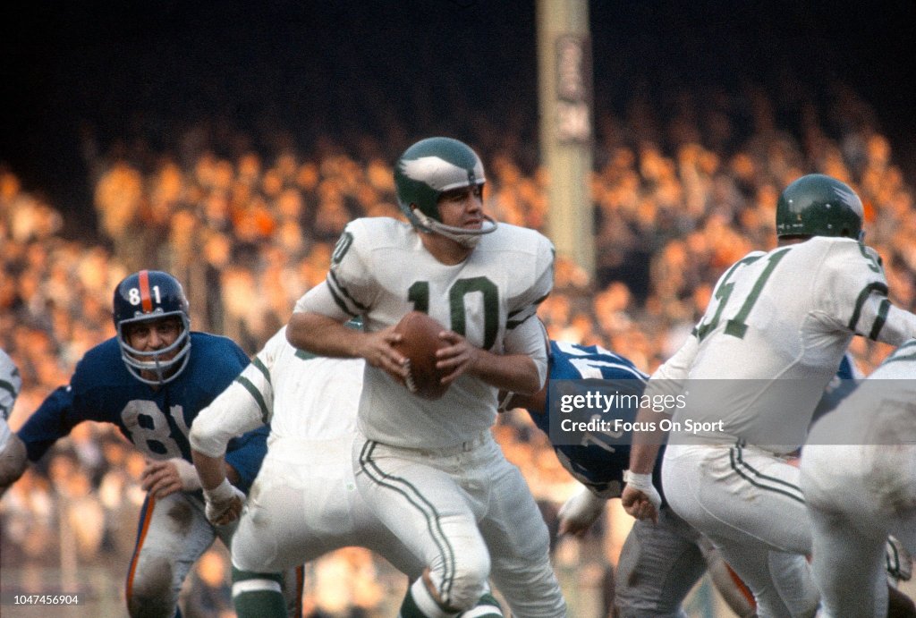 The New York Giants charged into a first-place tie in the Eastern Conference of the National Football League by rolling over the battered Philadelphia Eagles, 42—14. Y.A. Tittle, the old Bald Eagle of the Giants, threw three touchdown passes and completed 16 of 20 for 261 yards. The victory put the Giants in a tie with the Cleveland Browns, who lost to Pittsburgh, 9—7. Both the Giants and Browns have 7-2 records. Phil King scored twice for the Giants, on a 38-yard pass play from Tittle and a three-yard romp around end. Tittle hit Joe Morrison on a seven-yard touchdown pass and Frank Gifford on a 14-yard toss. Alex Webster drove home from the two after a 40-yard pass from Y.A. to Aaron Thomas. Don Chandler added the five extra points. The Eagles were in the ball game only briefly. A 64-yard bomb from King Hill to the fleet Tommy McDonald tied the score at 7—7 in the first period. After that, the Giants simply battered the Eagles’ offensive line and hounded Hill and his successor, former Giant Ralph Guglielmi, who made his first appearance for Philadelphia.