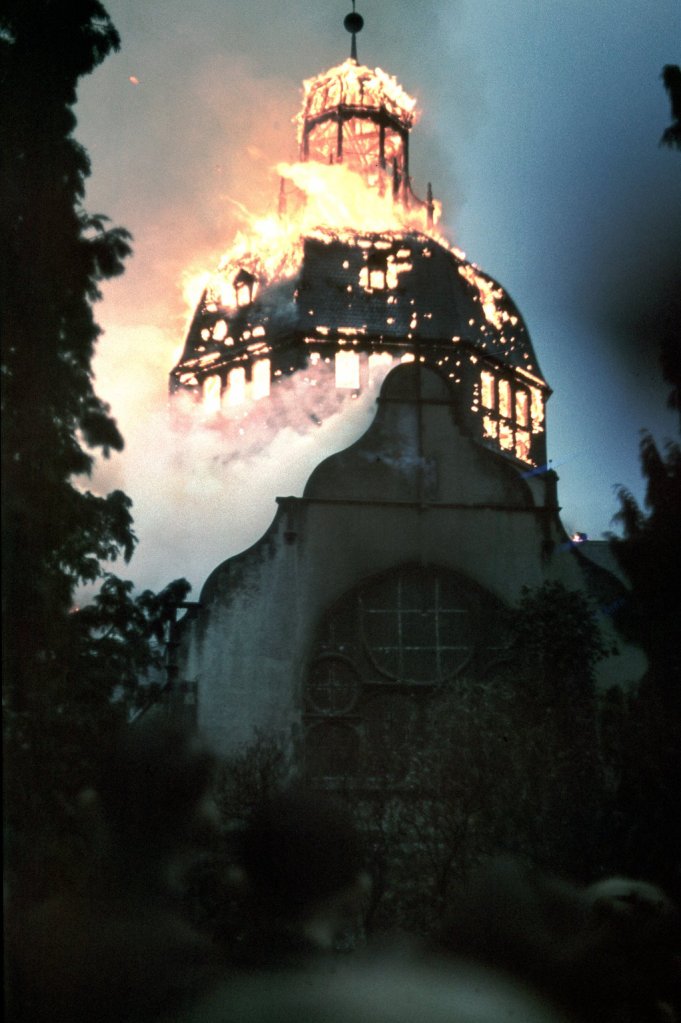 Photograph: The Great Berlin Synagogue burning during Kristallnacht, 10 November 1938.