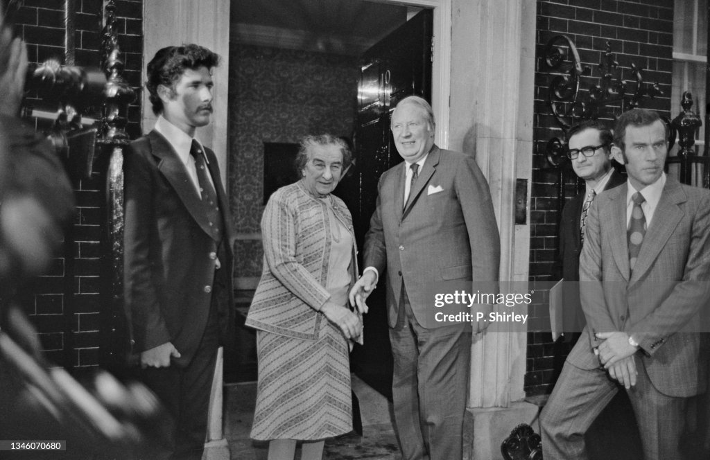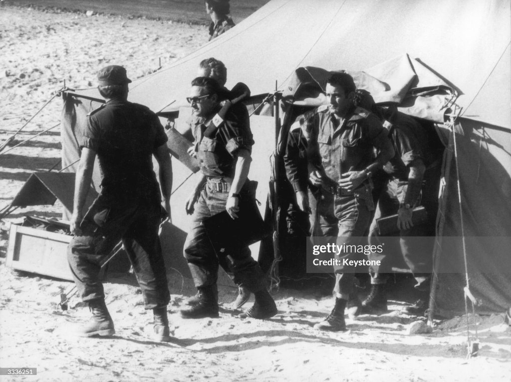 Photograph: Israelis led by General Yariv (wearing glasses), leave the tent after signing the peace accord brokered by U.S. Secretary of State Henry Kissinger, between Israel and Egypt, 12th November 1973.