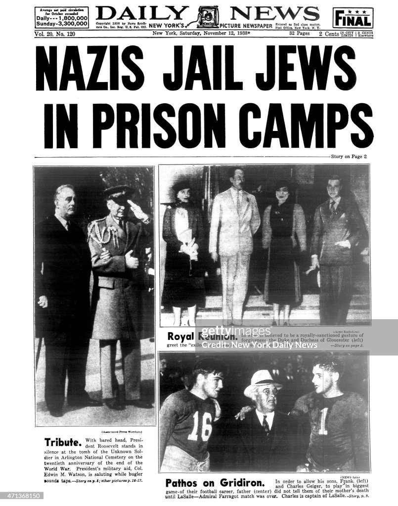 Photograph: New York Daily News front page, November 12, 1938. Headline: “NAZI JAIL JEWS IN PRISON CAMPS.”
