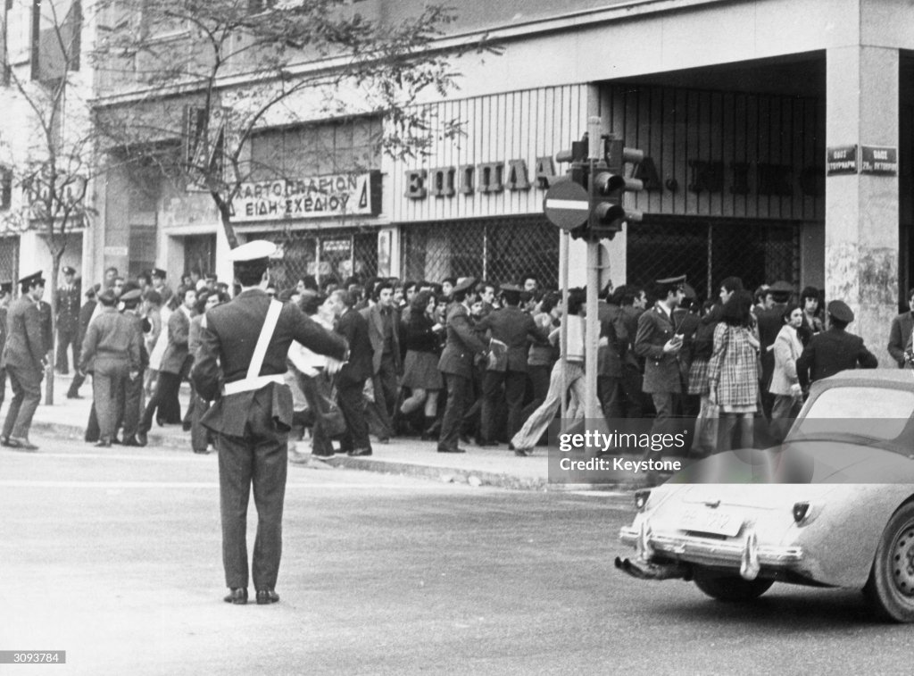 A Greek military tribunal handed down stiff penalties for violations of martial law in Athens. Mass arrests have occurred there. Students, professors, left-wing members of Parliament and workers are being detained. In Athens, all persons are under surveillance. President Papadopoulos was not happy over the filming of the enforcement of martial law. The violence started at a university over the weekend; the Army and the police now control the universities.