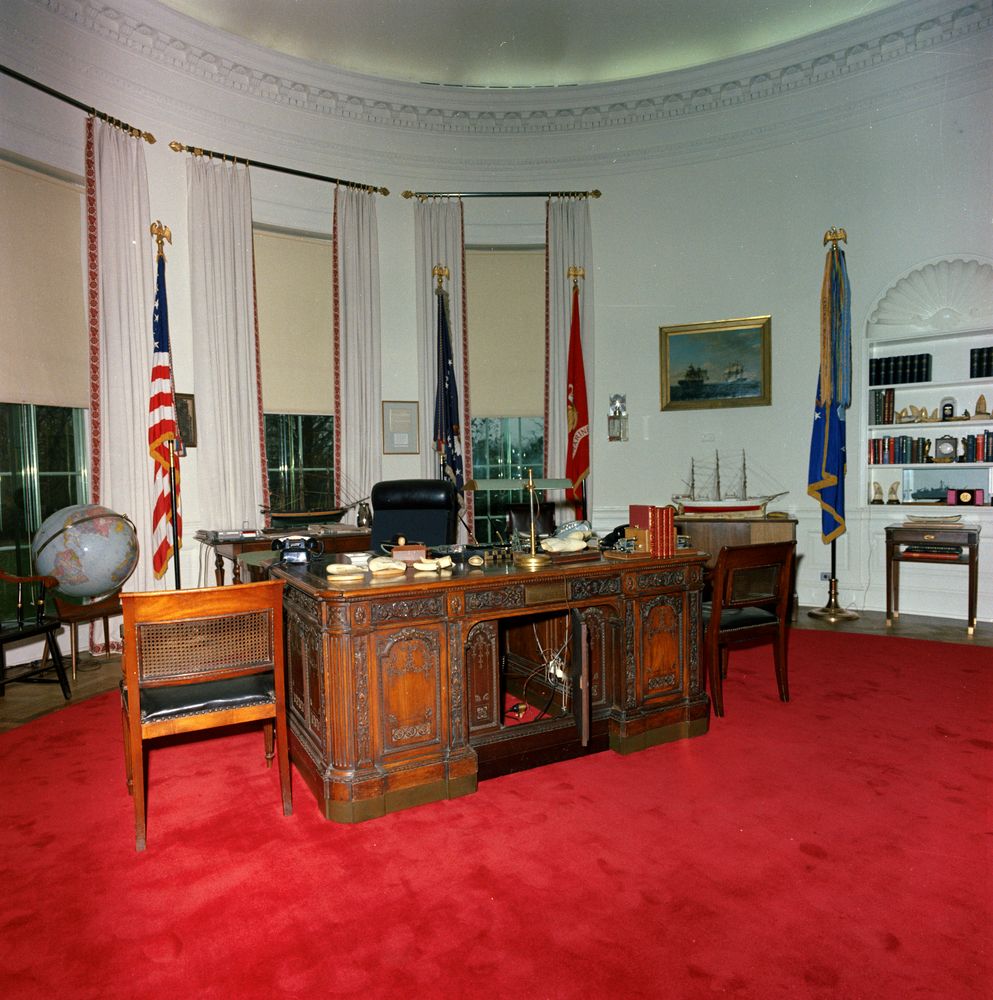 Shortly after it was placed upon the catafalque [platform] in the black crepe-draped White House East room, Mrs. Kennedy and 14 others heard brief prayers said by two priests who remained with the flag-draped casket through the night. Mrs. Kennedy snatched a few hours of sleep, then, at 10 a.m. today, she and the children attended a private mass in the East Room. It is believed to be the first mass ever said in the executive mansion. Attorney General Robert Kennedy, the late President’s brother, carried little John into the mass, some persons present said. Caroline wept a little during the service, it was reported. This morning, President Johnson and his wife visited Mrs. Kennedy in the family, second floor living quarters for 20 minutes.