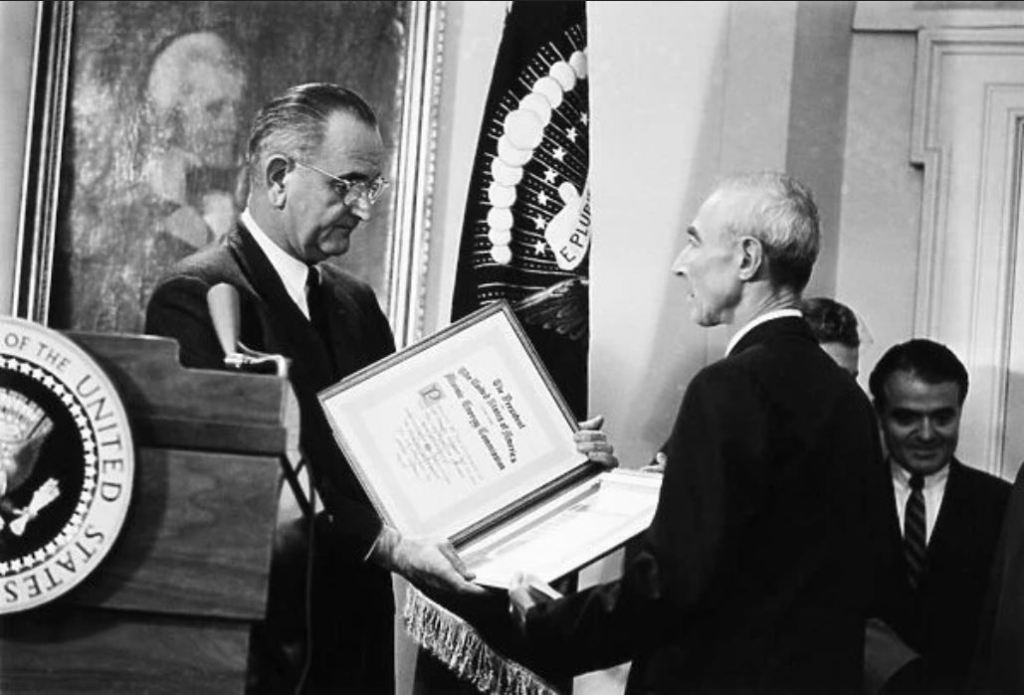 President Johnson today presented a gold medal, a citation, and a United States treasury check for $50,000, tax free, to Dr. J. Robert Oppenheimer, the controversial nuclear scientist designated a security risk nine years ago by the Atomic Energy Commission. The award made in the White House cabinet room in the presence of about 50 invited guests, including Mrs. Johnson and Mrs. Oppenheimer; the secretaries of state and defense; the chairman and past chairmen, present and past members of the AEC, and Democratic members of the joint Senate-House Atomic Energy Committee. President Johnson read the citation which hailed Oppenheimer for his contributions to theoretical physics, as a teacher and originator of ideas, and for leadership in developing the first atomic bomb during World War II.