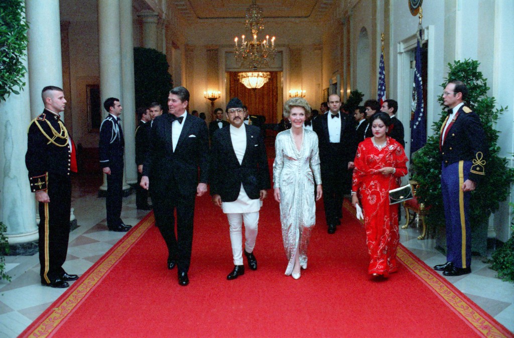 President Reagan greets King Birendra Bir Kikram Shah Dev and Queen Aishwarya Rajya Laxmi Devi Shah of the Kingdom of Nepal. President Reagan hailed King Birendra of Nepal today as a champion of peace and expressed sympathy about problems he is encountering in trying to improve the quality of life in his Himalayan kingdom. Welcoming King Birendra and Queen Aishwarya at the beginning of a two- week visit to the United States, Mr. Reagan praised the King for condemning the Soviet intervention in Afghanistan and volunteering military forces for United Nations peacekeeping missions.