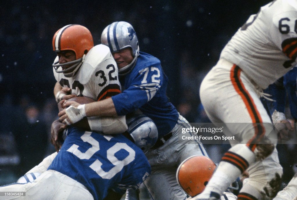 In their first show of life, the Browns, on the first play after the next kickoff, shook loose Ernie Green for a 74-yard run to the Detroit 6. It was prophetic that out of this glowing opportunity, the Browns netted only a 19-yard field goal by Lou Groza. Then, in what shaped up at the time as a possible turning point, Cleveland moved 80 yards in five plays to a touchdown following Vince Costello’s interception of an ill-advised pass by Morrall from Cleveland’s 12. The Browns’ tally came on a spectacular 49-yard pass from Frank Ryan to Gary Collins. With half the Lions in hot pursuit, Ryan fired the ball more than 60 yards through the air. Collins made a leaping catch in the end zone after being pushed off balance by Bruce Maher (who would have been charged with interference if Collins did not make the catch). But this sudden turnabout did Cleveland no good. When the teams returned to the sodden field after the intermission, Detroit took absolute charge.