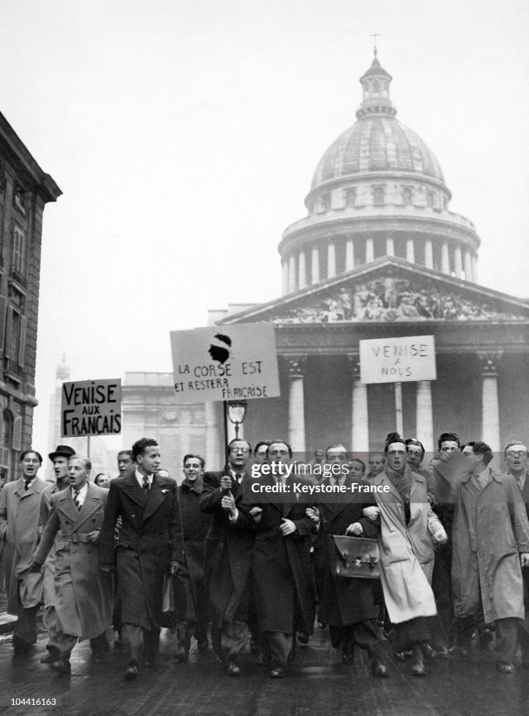 Some 8,000 students from the Sorbonne stage a mock demonstration in Paris, demanding “Venice for the French! and “Give Italy back to Corsica!””
