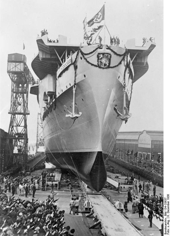 The Kriegsmarine (German Navy) aircraft carrier Graf Zeppelin is launched by Deutsche Werke, Kiel, Germany. She is 85% complete at the end of 1939, but constant problems keep her from ever being completed.