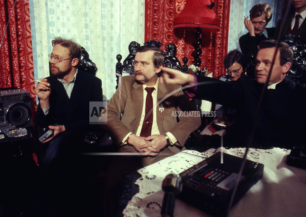Smiling broadly, Lech Walesa, founder of the outlawed Solidary union movement, stood in a crowded church rectory near the Gdansk shipyard this afternoon, listening to a broadcast over Radio Free Europe of the ceremonies in which his wife accepted his Nobel Peace Prize. Surrounded by foreign journalists and well-wishers at St. Bridget’s Church, Mr. Walesa offered a toast at the end of the ceremony with champagne sent by workers in Poznan “for the victory of the ideas of Solidarity.” Not all who tried to listen to the Nobel ceremony were successful. BBC transmissions to Poland were being jammed, and Poles who tried to listen to the Voice of America broadcast in the Warsaw area said it was jammed, too.