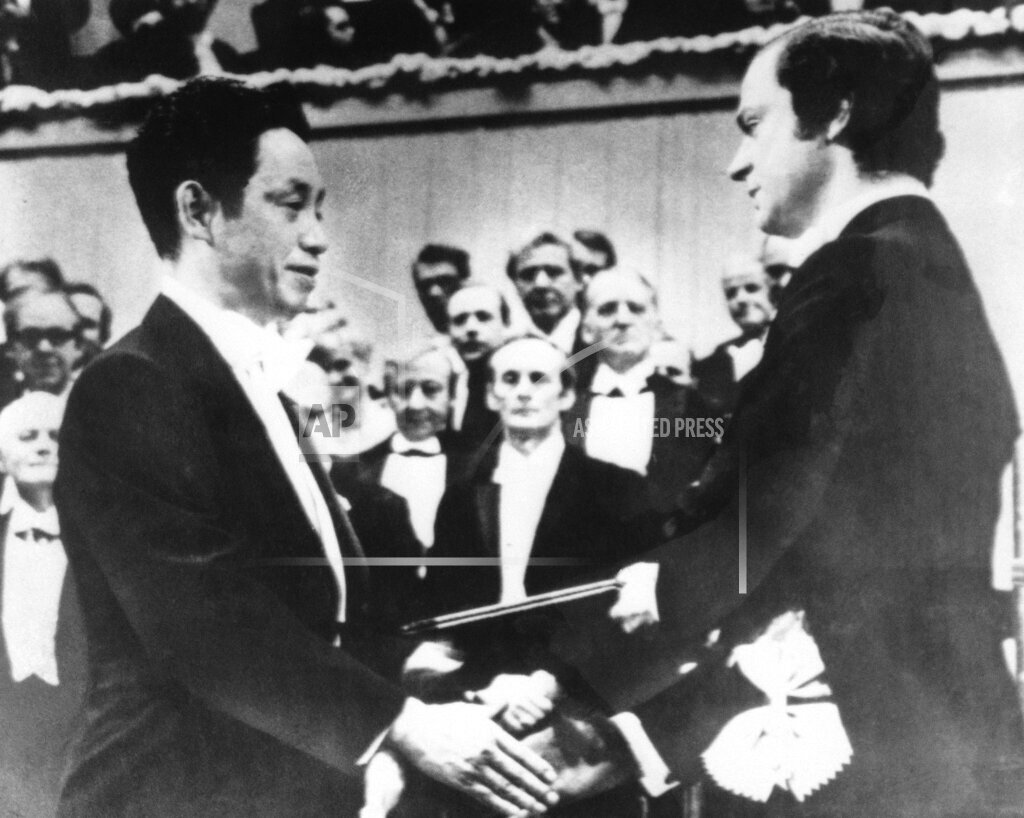 Thomas Byrne, the U.S. ambassador to Norway, accepted the Nobel peace prize on behalf of Henry Kissinger, as demonstrators protested Kissinger’s winning of the peace prize.