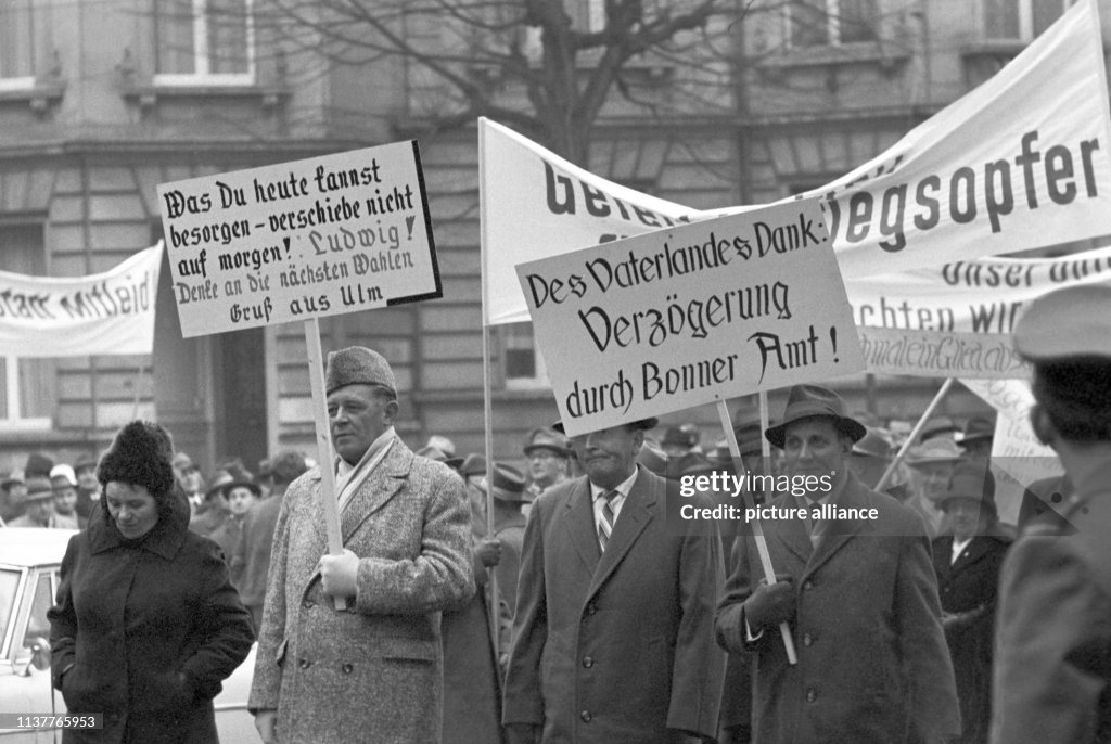 Veterans of the armies of Kaiser Wilhelm and Adolf Hitler, 35,000 strong, shuffled and hobbled through the streets of Bonn in a demonstration for higher pensions.