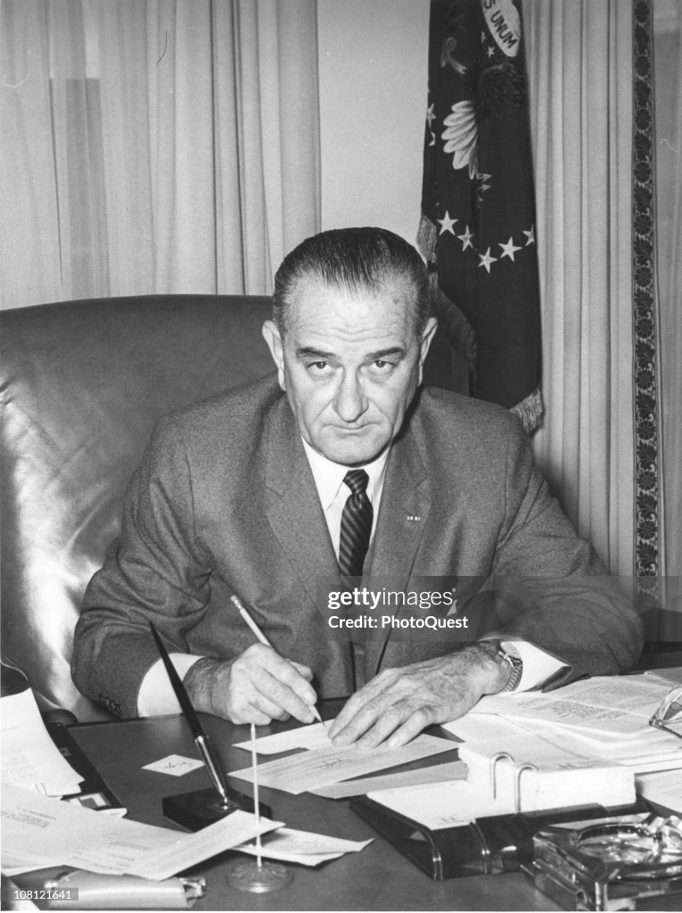 President Johnson told the nation’s top defense strategists that America’s most urgent task is elimination of Communist subversion in Vietnam and the Caribbean.
