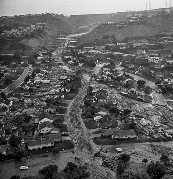 At 3:38 in the afternoon, an earthen dam gave way, sending one million cubic meters (300 million gallons) of water from a city reservoir down into the Los Angeles suburb of Baldwin Hills, California. More than four hours earlier, the dam’ caretaker reported an unusual amount of water flowing over the spillway and notified Los Angeles Department of Water Resources engineers and safety officials. Evacuation of the suburb of 16,500 residents began while an attempt was made to slow the leakage with sandbags, but by 1:30, a one-fifth inch wide crack in the wall began to widen. By 1:45, the gap had increased to three inches, and the downstream side of the dam began to leak by 2:00. By 3:15 the break had widened to nearly 10 feet and the dam burst 23 minutes later. More than 200 homes were destroyed but, because of the evacuation, only five people were killed in the disaster.
