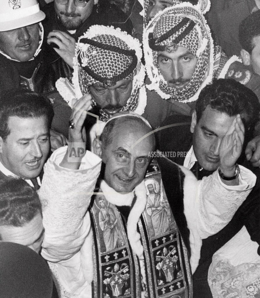Pope Paul VI became the first Roman Catholic pontiff to fly in an airplane, the first to visit the Holy Land, and the first to venture outside of Italy since Pius VII 1809. Pope Paul departed from Rome on a chartered Alitalia DC-8 jet to Amman, Jordan, and was welcomed in the Muslim kingdom by King Hussein. Afterward, the Pope and his party traveled by motorcade to the border crossing at Jenin (then a part of Jordan) and into Nazareth in Israel, followed by a welcome by over 100,000 at Jerusalem.