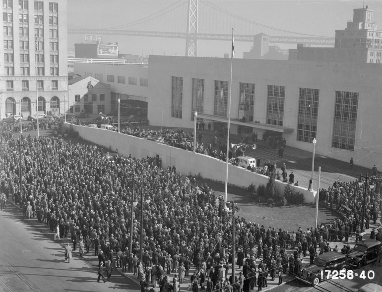 In San Francisco, mayors of Northern California cities participated with State officials today in dedicating the $18,000,000 railway facilities for the San Francisco-Oakland Bay Bridge. The services likewise were a “farewell” to the fleet of passenger ferries which have connected San Francisco with the northern and central part of the State for 75 years. While flags were raised and speeches were made today, tomorrow will be the first day for the public to use the electric railway system and inspect the glistening $2,300,000 glass and concrete terminal in San Francisco.