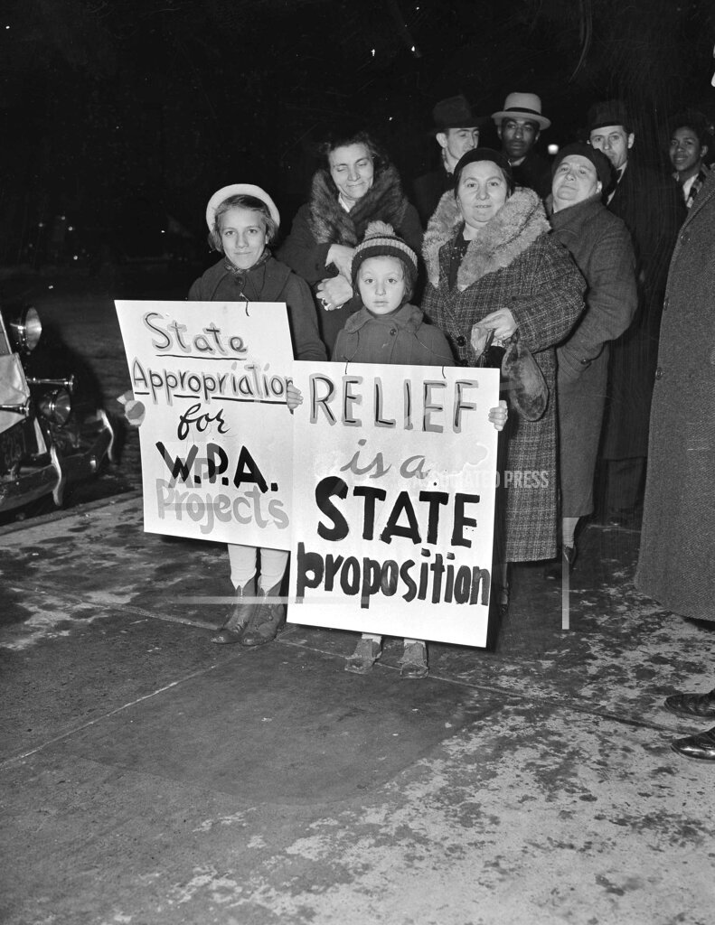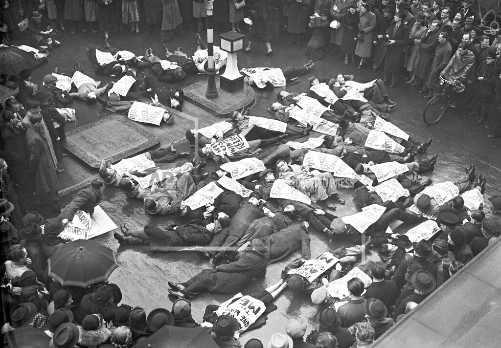 Theater employees use sit-down strike tactics to protest WPA budget cuts.