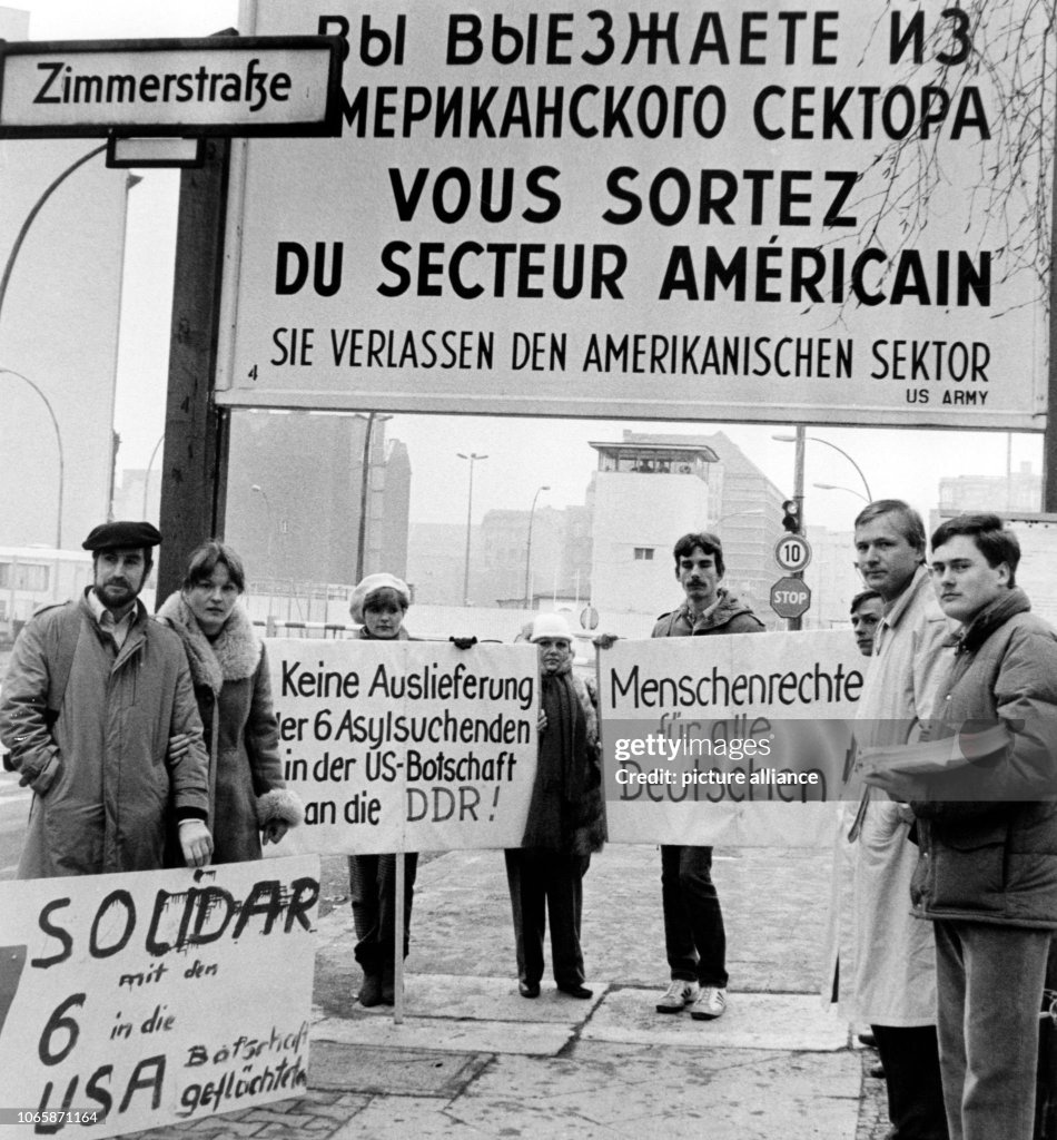 Six East Germans entered the United States Embassy in East Berlin Friday, saying they would stay inside until they were granted political asylum in the United States. Today they appealed to President Reagan and said they would not eat until the Communist Government gave them exit visas. Additional police were stationed outside the building today as American and East German diplomats met to try to resolve the standoff. The five men and one woman said they were on an “open-ended hunger strike,” but it could not be confirmed whether they were refusing food. The East German Foreign Ministry refused all comment on the case, the first known incident of its kind at the American Embassy in East Berlin.