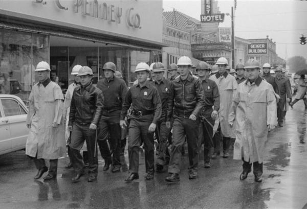 A phalanx of cops and volunteer “auxiliary police” in helmets and rain slickers, guns on their hips, clubs in their hands, march down the middle of Main Street towards the protesters. Using a bullhorn, they issue their order: “This is the Hattiesburg Police Department. We’re ordering you to disperse. Clear the sidewalk!” The pickets hold the line. No one leaves. The cops threaten again. The pickets hold. SNCC leader Bob Moses is arrested for “Disturbing the Peace” when he tries to escort an elderly Black woman into the courthouse to register. But none of the pickets are arrested. For the first time in living memory, an inter-racial civil rights demonstration in Mississippi is not suppressed. As it becomes clear there won’t be a mass jailing, more people join the picket line, swelling it to over 200 who by the end of the day are massed on the courthouse steps singing freedom songs.