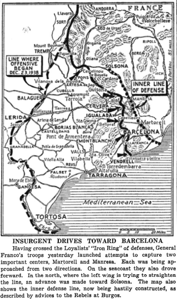 Generalissimo Franco’s “win the war” offensive is being carried through its fifth week without giving the Republicans (Loyalists) the slightest respite. In the last few days, the Nationalists have captured Vendrell, Villafranca, Villanueva, Igualada, and Sitges, thus speeding up the drive’s final phase and obliging the Republicans to withdraw behind their last defense line. This line runs from Solsona, in the north, via Cardona to Manresa, whence it follows the course. of the Llobregat River to the sea. Generalissimo Franco’s troops are now approaching the trenches just outside Barcelona. The entire Tarragona province is now in Generalissimo Franco’s hands. His forces operating on the southern Catalan front today pushed further toward Barcelona from Villafranca, which was taken yesterday, to occupy San Quintin de Mediona and San Pedro de Riudevitiles besides San Saturnino. General José Solchaga’s Navarrese division and General Juan Yagüe’s Moroccan Army Corps may strike to the northeast together along the railroad to Martorell where they could cut the main. highway leading through Manresa to Solsona and Berga. San Saturnino is only about seven miles from Martorell.