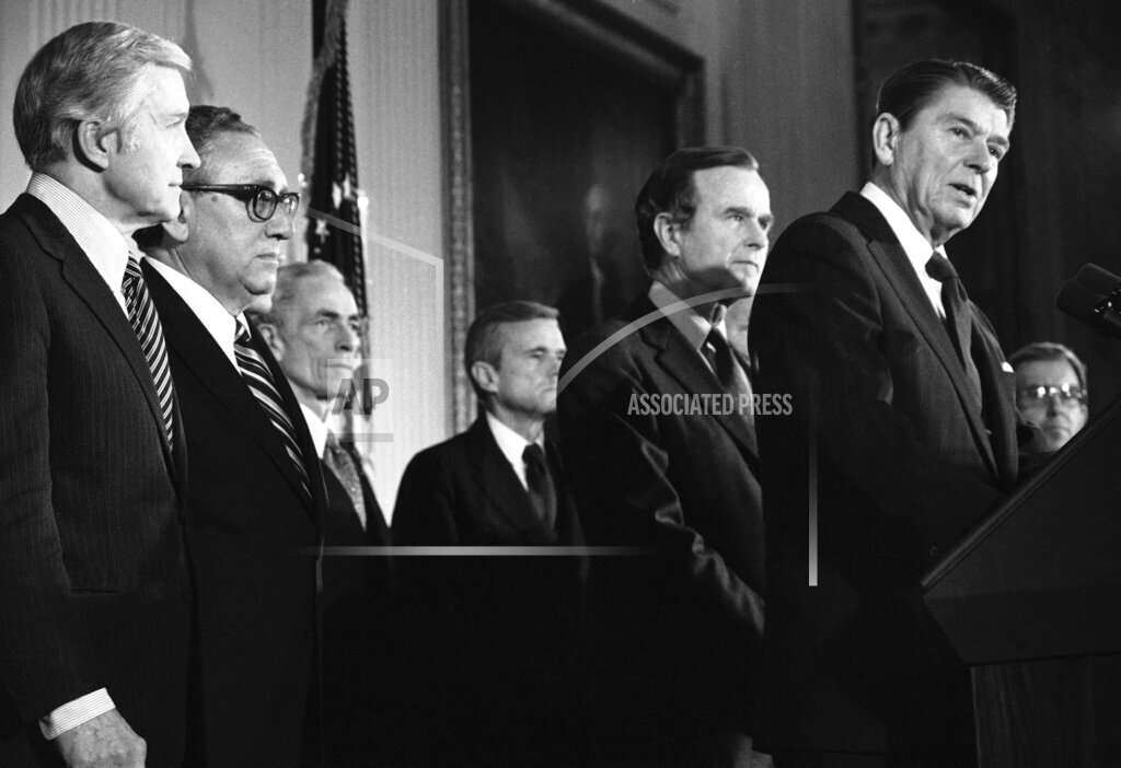 President Reagan meets with Congressional Leadership about his plan to implement the Kissinger Commission’s report on Central America. Military aid to El Salvador would be increased by $312 million over the next two years in a five-year program of aid to Central America proposed by President Reagan. The program’s total cost would $8 billion. The Administration is insisting that the President “control the spigot” of new aid, an official said.