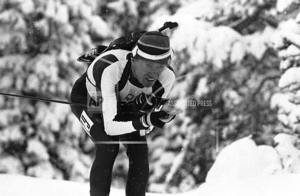 Peter Angerer of West Germany charged past Jan Matousch of Czechoslovakia on the final leg of the 20-kilometer biathlon today and won the Olympic gold medal in 1 hour 11 minutes 52.7 seconds.