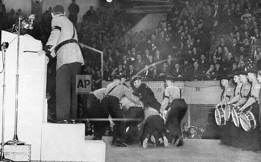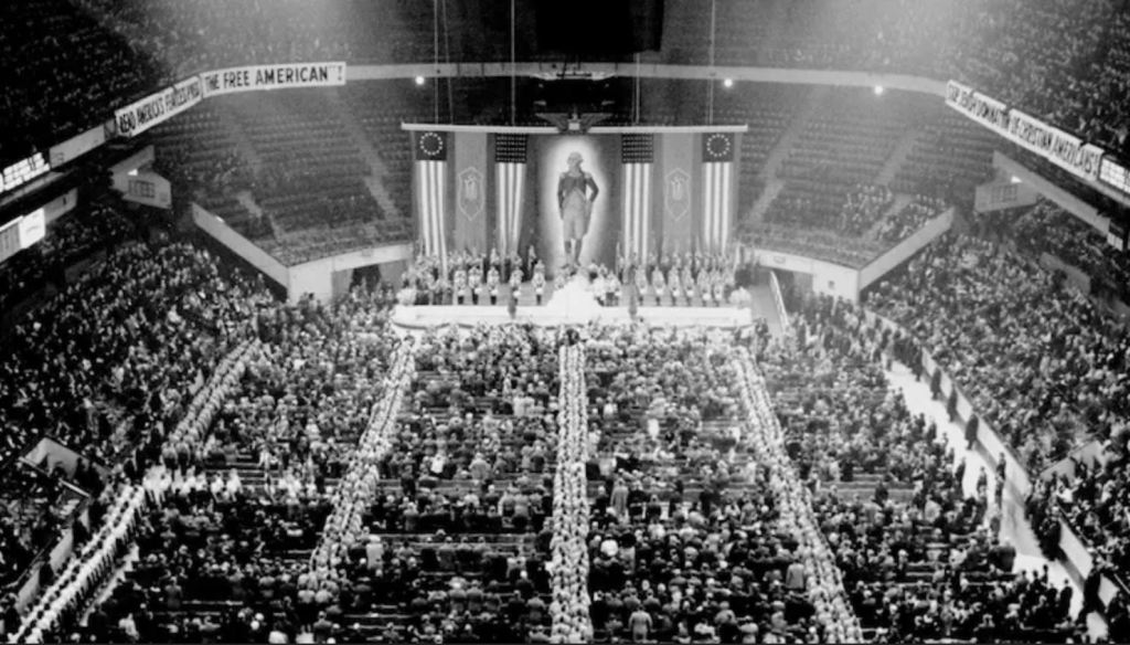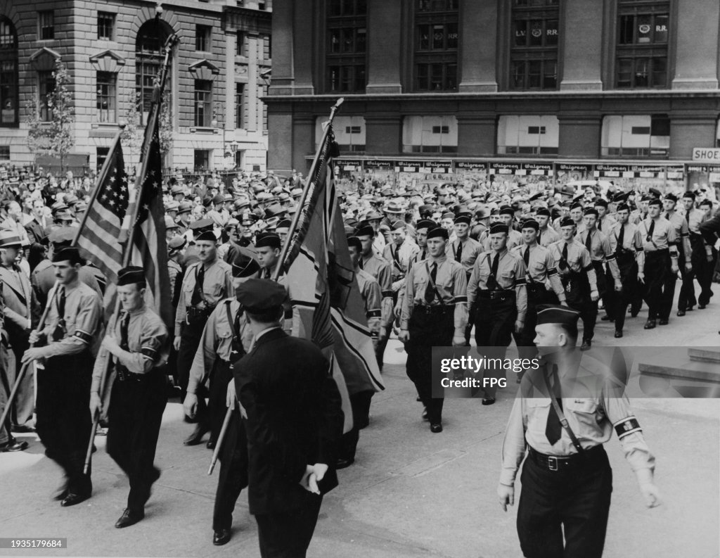 Last to speak, the Bundesführer himself, Fritz Kuhn, continued to push the anti-Semitic theme, going as far as calling President Roosevelt ‘Rosenfeld’ and calling Fiorello La Guardia, the man whom he promised to make no anti-Semitic remarks about, Fiorello “Jew Lumpen” LaGuardia. Everything came to an immediate halt in the middle of Kuhn’s final speech because a man who was dressed in blue broke through the lines of OD men, ran onto the stage, and charged at the speaker. Quickly swarmed by the Ordnungsdienst, the Bund’s paramilitary, he was subdued in an effective routine of punches and stomps which exemplified an ‘uncanny replication of Nazi thuggery’ [as] a pack of uniformed men blast[ed] away with fists and boots on a lone Jewish victim.” Later identified as 26-year-old plumbing assistant Isadore Greenbaum, the lone victim was pulled away by a team of police, saving the young man from serious injury. Attempting to control the riled-up crowd, Kuhn delivered his rousing finish, advocating the establishment of an America which would be ruled by White Gentiles, free from a Jewish Hollywood and news. “The Bund is open to you, provided you are sincere, of good character, of White Gentile Stock, and an American Citizen imbued with patriotic zeal. Therefore: Join!” As Kuhn exited the stage, 20 thousand Bund members chanted “Free America! Free America! Free America!” in the biggest Nazi rally in United States history.