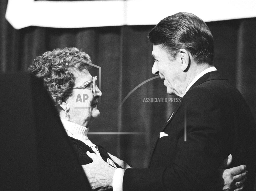 President Reagan receives the “Rose of Assisi” for his peace efforts from the Mayor of Assisi, Italy and two monks from St. Francis of Assisi’s monastery.