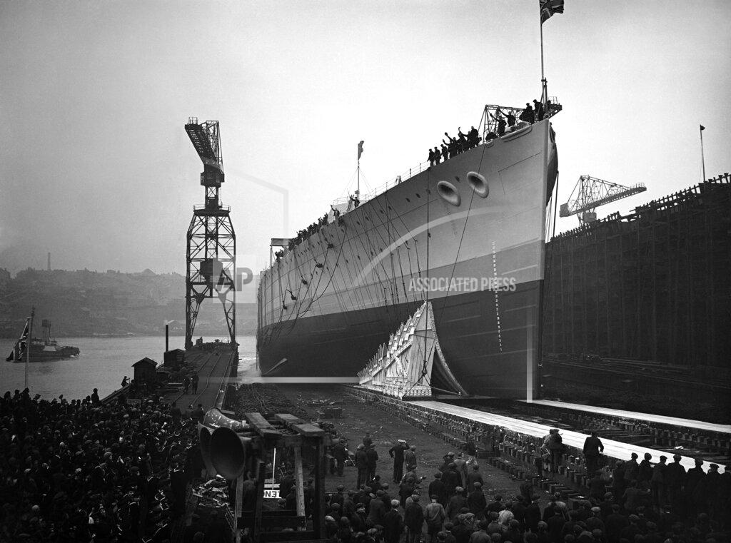 The Royal Navy battleship HMS King George V (41), lead ship of her class of 5, is launched by Vickers Armstrong (Newcastle-on-Tyne, U.K.).