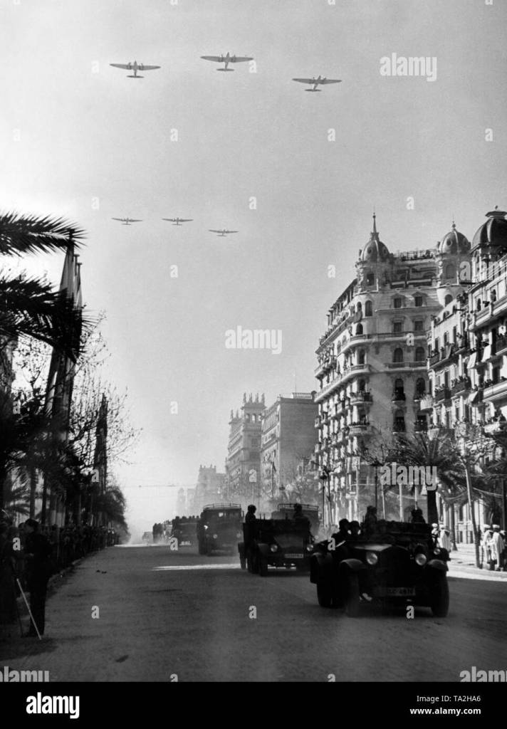 Four hundred warplanes roared overhead as infantry, artillery, tanks, cavalry, ambulances and other modern military hospital services, such as blood-transfusion and X-ray trucks, as well as motorized wireless, telephone and telegraph equipment, marched past. It was the greatest display of war strength Spain had seen since the days of her famous armada and her colonial conquests in the New World.