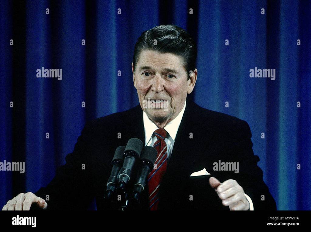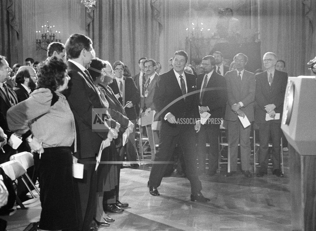 President Reagan tapes a message about the school prayer amendment. Mr. Reagan called on both houses to approve a proposed Constitutional amendment that would supersede the Supreme Court ban on government-sponsored prayer in public schools.