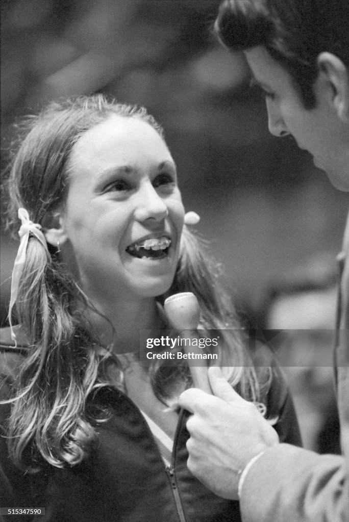 Mary Decker, a 95‐pound, 15‐year‐old half‐miler, helped chauvinistic fans forget victories by New Zealanders in the prestigious men’s one- and three-mile runs last night at the Amateur Athletic Union indoor championships. Miss Decker received written permission from her teachers in California to compete in the women’s 880‐yard run at Madison Square Garden. She has braces, a few acne pimples and wears pigtails. She also set a meet record of 2 minutes 7.1 seconds. Last week she set the world indoor mark of 2:02.4. Last night she survived the experienced Abby Hoffman’s closing rush. Miss Hoffman, of Toronto, drew even on the final turn, but was put away in the stretch.