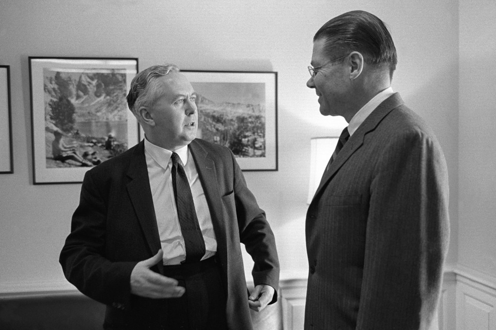 Harold Wilson, leader of the British Labor party, conferred with President Johnson today as the high point of three whirlwind days of conferences with United States foreign policy officials. Mr. Wilson, who may become Britain’s Prime Minister before the end of the year, came to Washington to establish new contacts and improve old ties with people in the Johnson Administration. Mr. Wilson, who had met President Johnson several times in the past, spent 50 minutes in the conference, which he described as an “enjoyable” and “frank” talk. He made a similar political reconnaissance visit here last year, before President Kennedy’s assassination. According to all accounts, he has this time impressed officials with his growing assurance of Labor’s prospects for victory. Mr. Wilson’s visit has also conveyed the impression that foreign policy will not be an issue in the British elections.