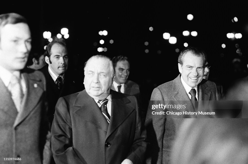 President Nixon arrived at Chicago’s O’Hare Airport and was greeted by Mayor Richard J. Daley, a few boos and several cheers. What did the two talk about on the ride into the city to Mr. Nixon’s hotel suite? “The great scenery and what a fine city we have,” answered the Democratic mayor. Mr. Nixon will appear today before the Executive Club of Chicago at 11 am PDT for a question-and-answer session on national television. It will be the first of several trips to give Mr. Nixon public exposure in the next few days. On Saturday he goes to Nashville for the opening of the new “Grand Old Opry” House and on Tuesday evening he will be in Houston for another question-and-answer period at the National Association of Broadcasters convention.