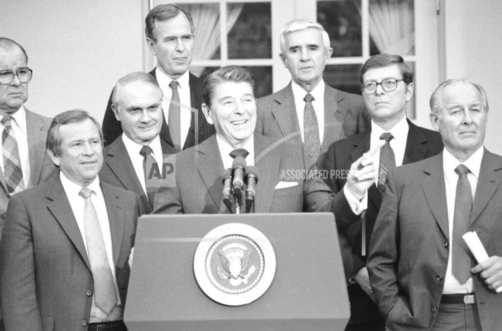 President Reagan makes an announcement to the press that the deficit reduction package has bipartisan support in both Houses of the Congress. A $57 billion cut in military spending over the next three years was accepted by President Reagan in an effort to break the deadlock on his proposed budget. Mr. Reagan’s action was part of an agreement reached with Republican Congressional leaders on a package to reduce the federal budget deficits by $150 billion over three years.