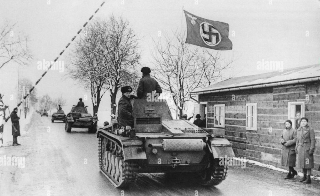 Groups of German school children lined the route that the occupying troops were to take on their march through the city, while German women were summoned to assemble in a square. German university students marched in their Nazi uniforms toward the outskirts of the capital to welcome the German troops.