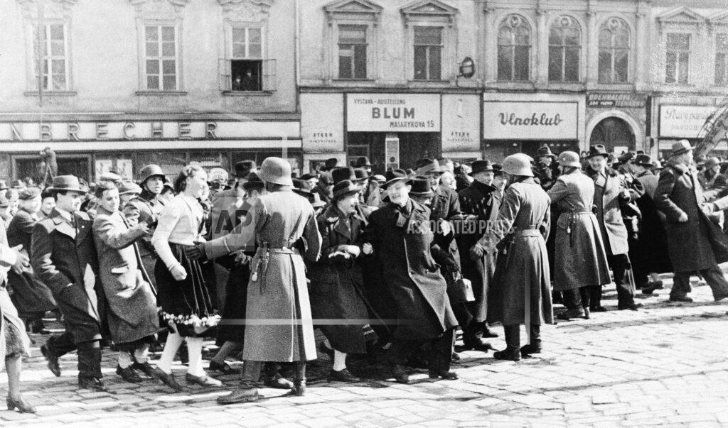 From every house flies the swastika flag by order of the Germans, giving the streets an appearance somewhat recalling last Summer’s Czech national festival, except that the color of the flags is changed, there are no gay national costumes, only the gray of the German uniforms, and there are no laughing, jostling crowds.People pass in silence before motionless sentries standing with riot guns at the ready outside the hotels, schools, and other buildings where the military are quartered, as they go by, they half-turn in sullen curiosity.