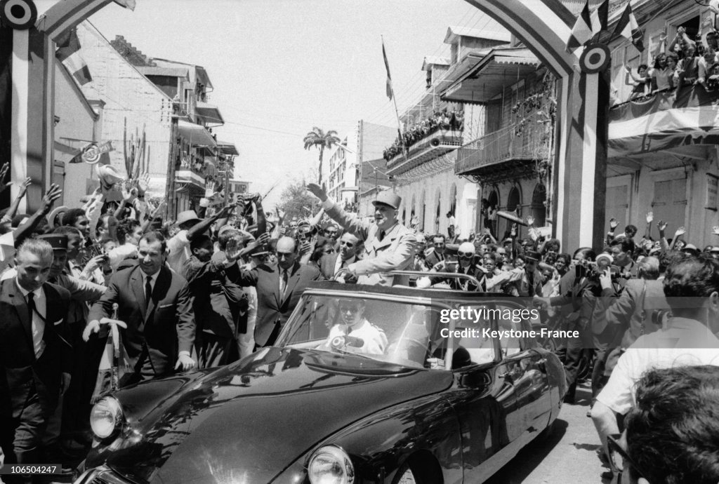 President de Gaulle declared today that France, in solidarity with her allies, was on guard against potential foes. But he said this solidarity did not diminish her independence. The French leader was addressing a wildly cheering crowd in the Place de Savanne. His welcome here was the most tumultuous and unruly of his visit to the French departments in the Caribbean and South America. After his speech security men had to fight a way through the crowd so that the general could reach his car. For a moment General de Gaulle’s tall figure was engulfed in a sea of heads and of hands reaching out to touch him. When the car started, dozens rushed after it while the deep‐throated chant “Vive de Gaulle!” echoed over the old city. More than 25,000 people jammed the square, clambering on trees and railings to see the President.