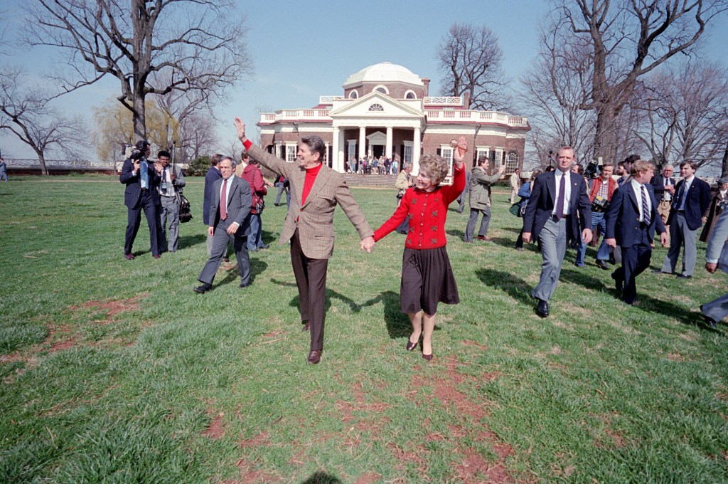 President Reagan tours Monticello, Thomas Jefferson’s home. President and Mrs. Reagan flew by helicopter to Charlottesville, Virginia, today to visit the home of Thomas Jefferson. Peter Roussel, a White House spokesman, said the Reagans were making use of “a nice spring day and doing some touring down there,” highlighted by a stop at Monticello, home of the nation’s third President.