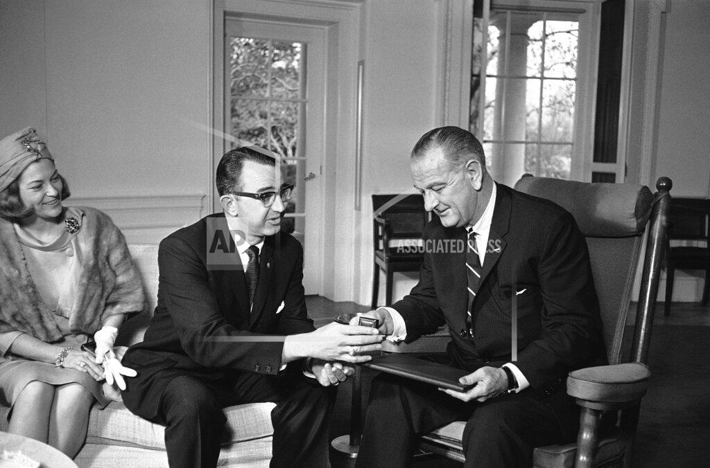 President Johnson received the Big Brother of the Year award today in ceremonies in his White House office. “I don’t know of any award that encourages me more,” Mr. Johnson said. He praised the Big Brother movement as a noble enterprise and said that the Administration’s announced war on poverty was a big brother movement. In another ceremony, he received the Lions International Head of State Medal, the organization’s highest decoration, and also an honorary membership in the Johnson City, Texas, Lions Club. Lions International presents the medal to each President and also to the heads of state in other countries in which it operates. The Big Brothers help fatherless boys between the ages of 8 and 17.