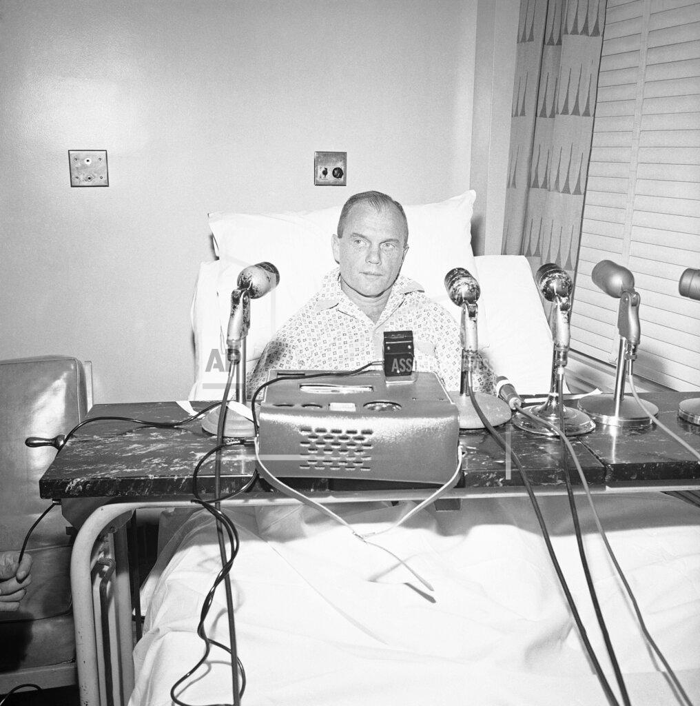 Lieut. Col. John H. Glenn Jr. announced from his hospital bed today that he was pulling out of the Senate race in Ohio. The former astronaut said that his slow recovery from a severe head injury barred an active campaign and that he did not think it fair to ask “the people of Ohio to vote for a name.” It was a “difficult decision” for the 42‐year‐old marine, who had orbited the earth and flown in two wars without injury only to “spin in” — as he put it — in a bathroom fall in his Columbus, Ohio, apartment last February 26.