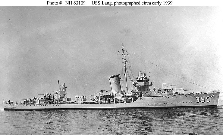 Lang departed New York 12 August 1939 guarding President Franklin D. Roosevelt’s passage to Campobello Newfoundland, and Nova Scotia. The President came on board the 24th at Sandy Hook, N.J., for transit to Fort Hancock. In November, the destroyer left Newport, R.I. for Galveston, Tex., and duty on the Gulf Patrol. Transferred to the Pacific, she reached San Diego 18 March 1940 and Pearl Harbor 2 April, where she participated in fleet problems and training exercises. She voyaged between the west coast and Hawaii throughout the remainder of 1940 and into early 1941 engaged in escort duties and training.