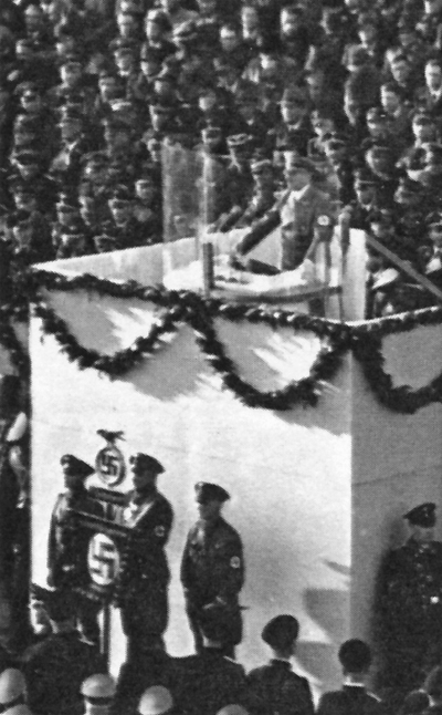 At the launching ceremony of German battleship Tirpitz, Adolf Hitler gave a fiery speech that was so extreme that it was decided at the last minute that it would not be broadcast to foreign nations in fear of talks of war provocation. The speech included a response to Neville Chamberlain’s pledge of the previous day to support Poland, saying “If they (the Western Allies) expect the Germany of today to sit patiently by until the very last day while they create satellite States and set them against Germany, then they are mistaking the Germany of today for the Germany of before the war.” The broadcast to the United States was cut off halfway, leading to false rumors that Adolf Hitler was assassinated amidst the speech.
