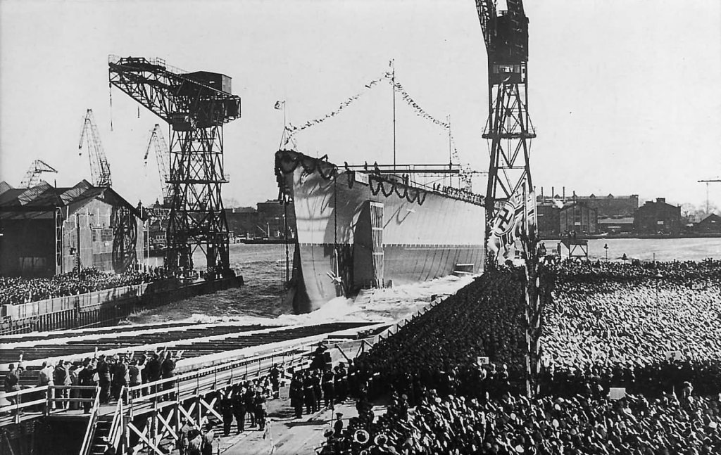 The Kriegsmarine (German Navy) battleship Tirpitz is launched by Kriegsmarinewerft, Wilhelmshaven (werk S 128). Grossadmiral Tirpitz’s daughter Frau von Hassel christened the battleship named after her father.