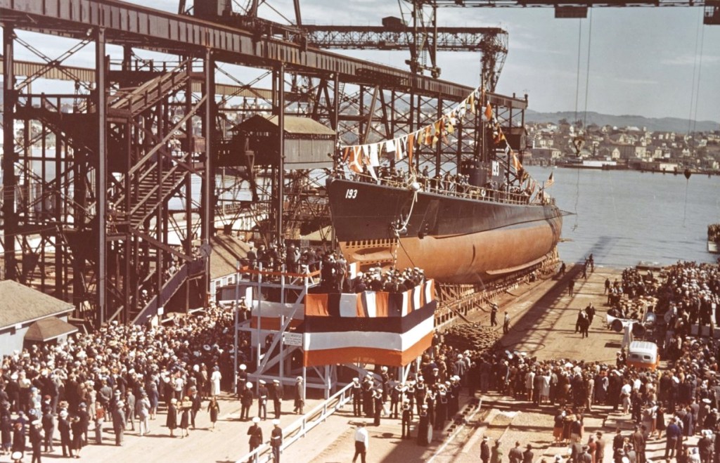 The U.S. Navy Sargo-class submarine USS Swordfish (SS-193) is launched by the Mare Island Navy Yard (Vallejo, California, U.S.A.).