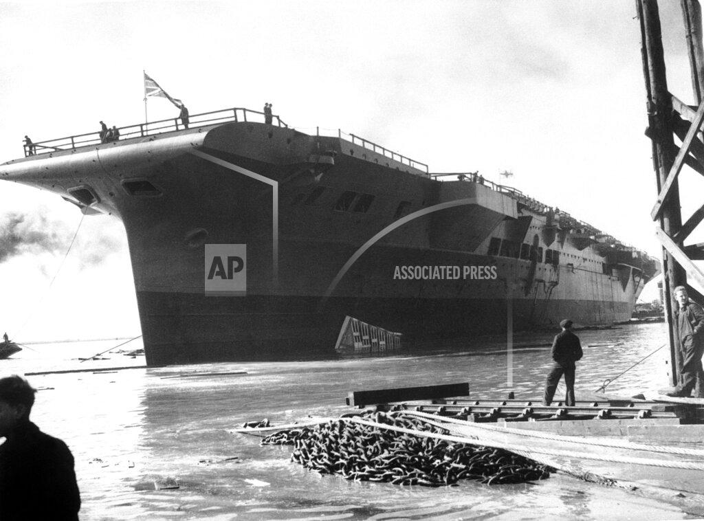 The Royal Navy aircraft carrier HMS Illustrious (87), lead ship of her class of 3, is launched by Vickers Armstrong (Barrow-in-Furness, U.K.).
